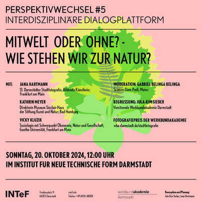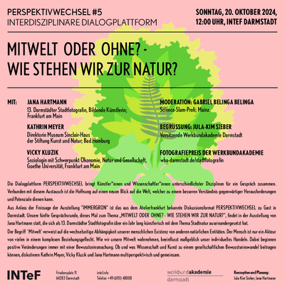 Aus Anlass der Finissage der Ausstellung “IMMERGRÜN” ist das aus dem Atelierfrankfurt bekannte Diskussionsformat PERSPEKTIVWECHSEL zu Gast in Darmstadt. Unsere fünfte Gesprächsrunde, dieses Mal zum Thema „MITWELT ODER OHNE? - WIE STEHEN WIR ZUR NATUR?“, findet in der Ausstellung von Jana Hartmann statt, die sich als 13. Darmstädter Stadtfotografin über ein Jahr lang künstlerisch mit dem Thema Stadtnatur auseinandergesetzt hat.